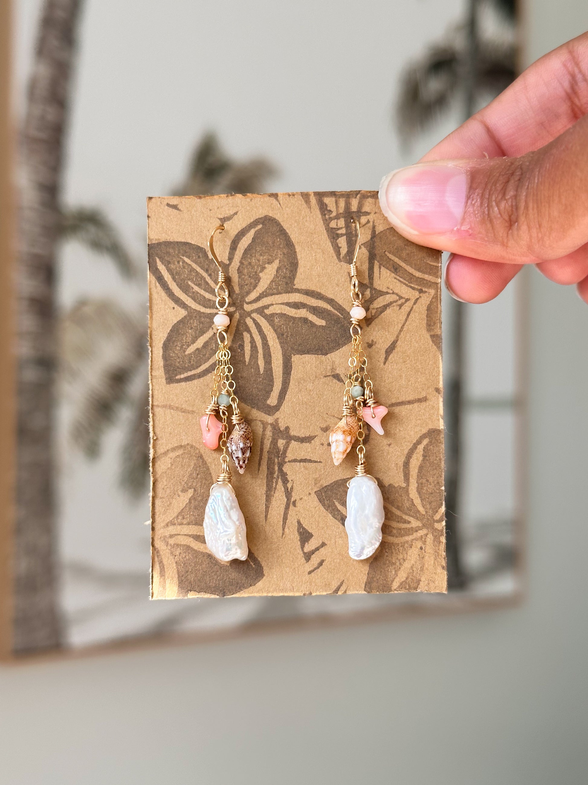 Dainty with natural ocean charms. Mini shells collected by hand in South Florida! Paired with bold freshwater pearls, pink coral, and amazonite gemstones.